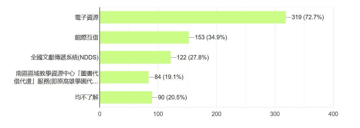 | 我知道圖書資訊館除實體館藏外,還有其他資源可供利用(複選) | 電子資源 | 319 | 72.7% | 284 | 76.3% | 262 | 73.4% | 274 | 75.1% | 340 | 78.3% | 比例圖 | |