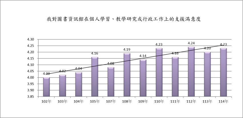 | 我對圖書資訊館在個人學習、教學研究或行政工作上的支援滿意度 | 4.23 | 4.2 | 4.24 | 4.16 | 4.23 |