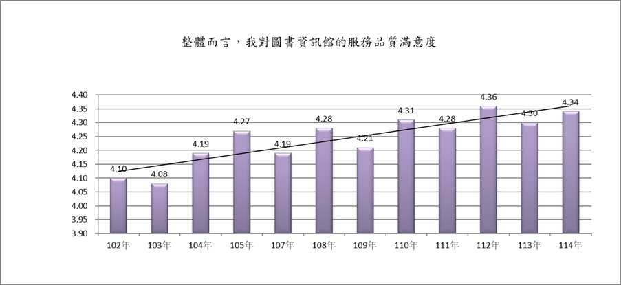 | 整體而言,我對圖書資訊館的服務品質滿意度 | 4.34 | 4.3 | 4.36 | 4.28 | 4.31 |
